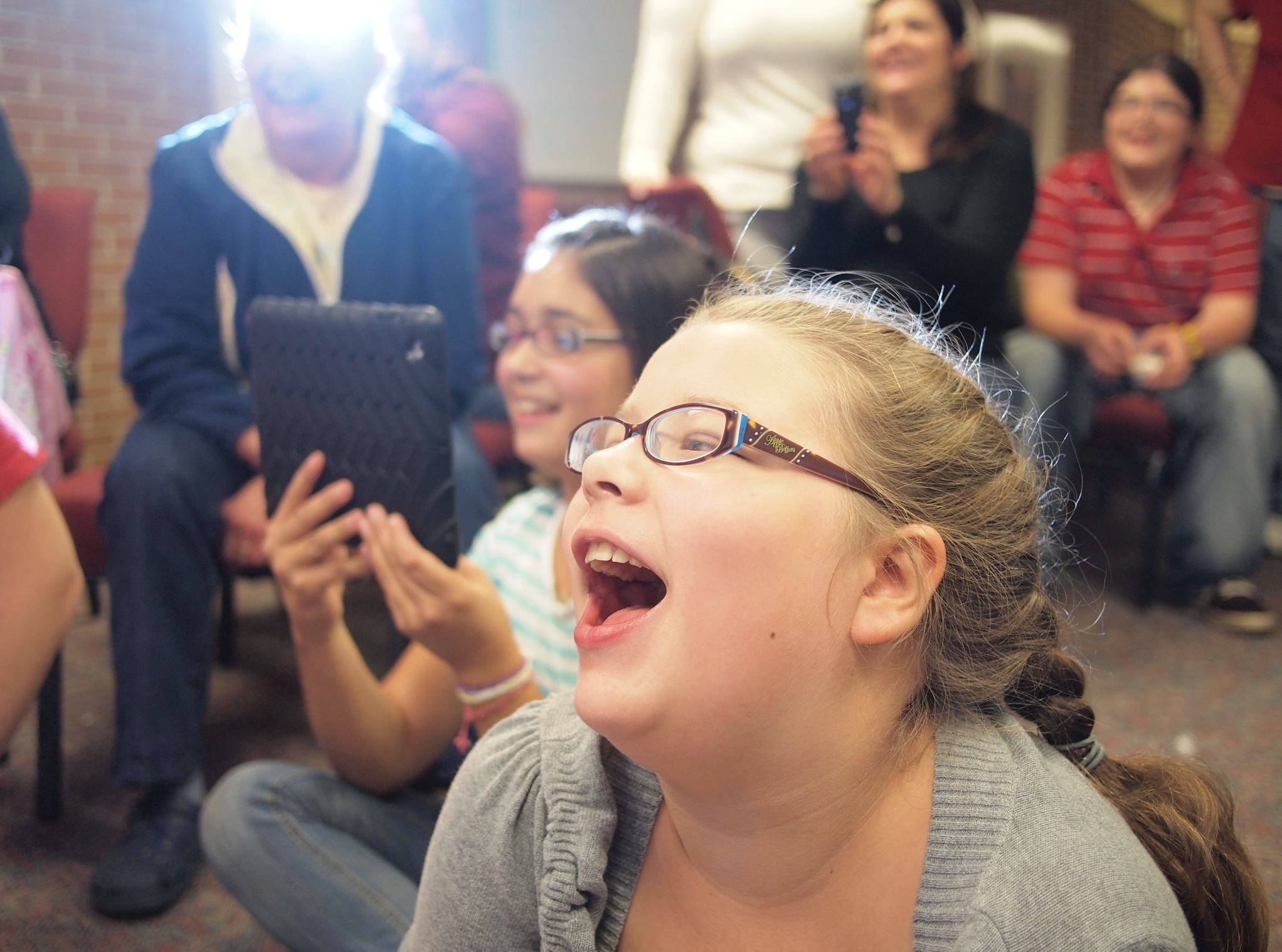 I took this photo as the birthday girl was opening her presents. The bright light is from the flash of another camera. I thought this image really captured the moment.