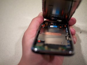 So I decided to replace the battery myself, and ordered a replacement battery from ifixit.com. It arrived in only a few days. I was excited to get started, so I didn’t bother reading the instructions before removing the two screws on the bottom of the iPhone. Then I already hit a wall and had to read the directions– I realized I didn’t know where the iPhone display separates from the bottom! After reviewing the directions, I read that the display is only the part of the phone inside the chrome bezel. Then I hit another stumbling block– how do I open the phone? Do I pry it open like my old 2nd gen iPod? Turns out I need a suction cup or duct tape to adhere to the screen so it can be pulled off. I really wish that information was more obvious, but I blame myself for not reading the instructions. I searched the apartment for about a half hour before I finally found something with a suction cup.