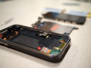 Once the iPhone was opened up, I followed the directions on ifixit.com to disconnect the tiny cables, remove the correct screws, and then pull out the logic board. Whenever there are lots of screws are being removed, it’s critically important to know where they go when it’s time to put them back in. For this project, I laid all the screws off to the side, in a pattern matching where they came from, so they look like a connect the dots puzzle. Removing the battery was tricky because it is glued to the back of the phone. I just kept prying and wiggling until it came out. I made sure not to apply to much pressure with the spudger tool because I was concerned that it might snap under pressure, but it survived.