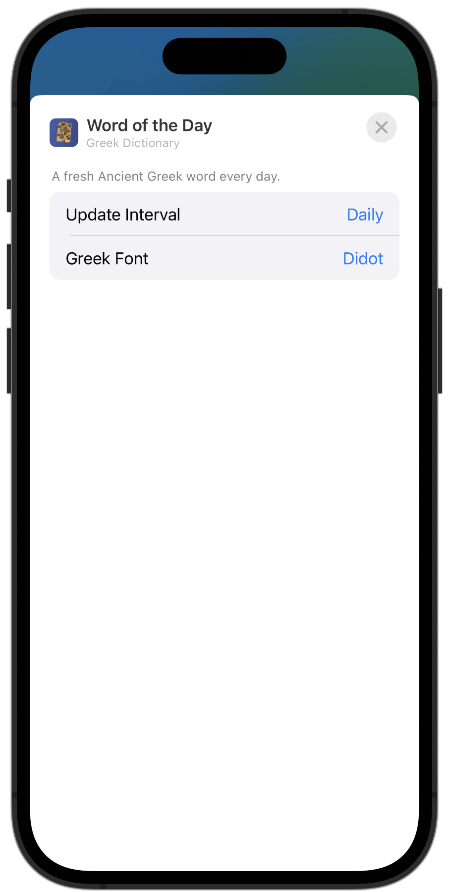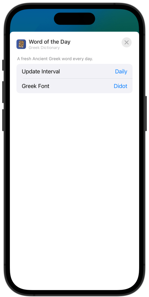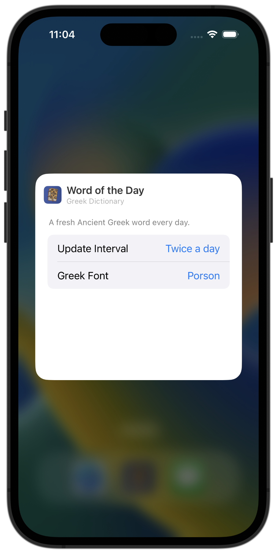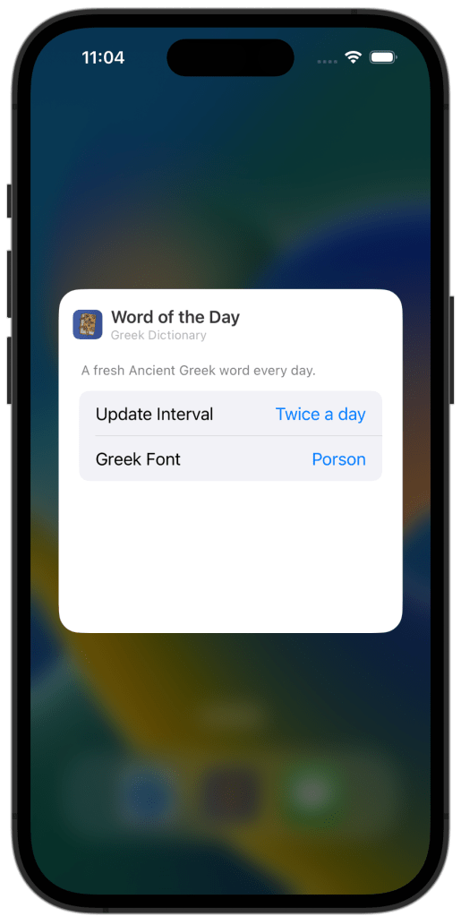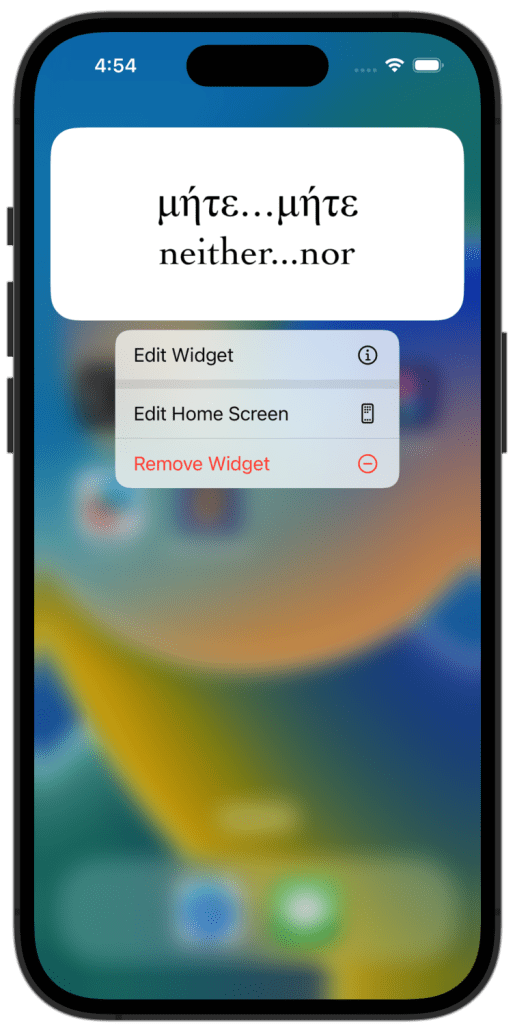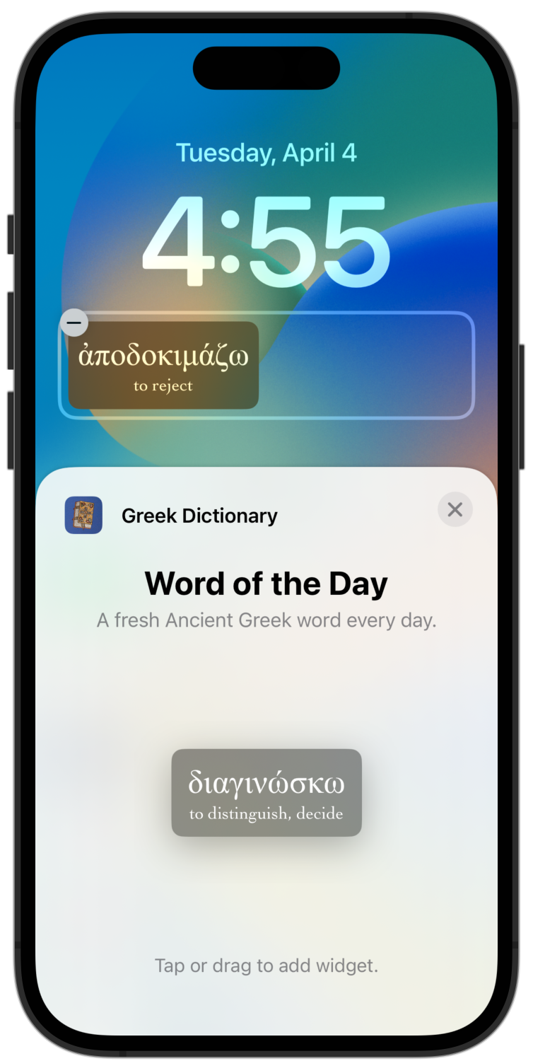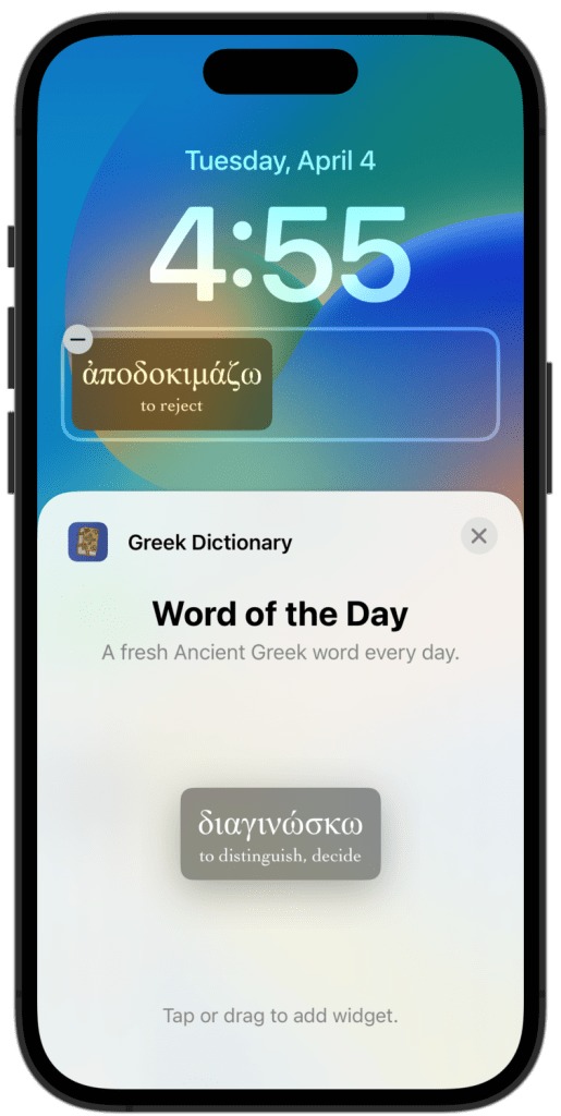 The Ancient Greek Dictionary Word of the Day Widget can be displayed on your iPhone’s lock screen and home screen. Apple has pretty good instructions for how to setup and configure widgets on your iPhone here: https://support.apple.com/en-us/HT207122