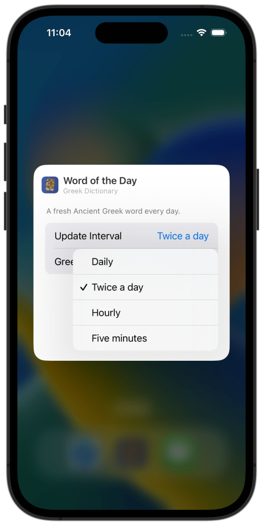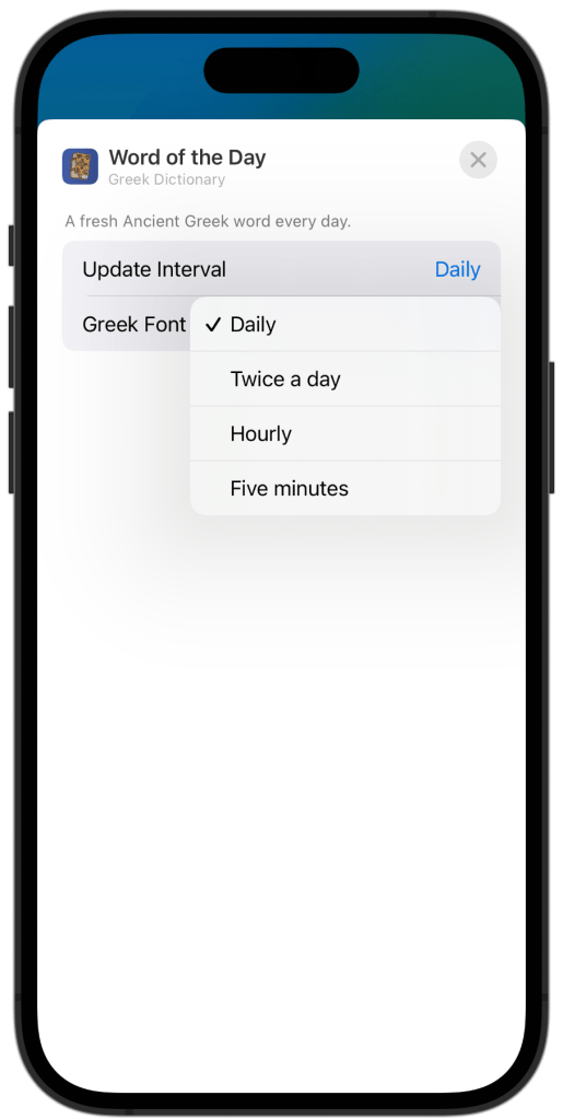 The Greek Dictionary Word of the Day widget can be configured for how often you want the Word of the Day to update. Currently, the options are Daily, Twice a day, Hourly, or Five minutes. You can also specify the font for the Greek text.